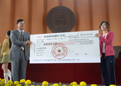 章必功校長在致辭中高度概括了助學貸款的意義,也給在座同學提出更高、更明確的要求。他認為,由于國人思維、傳統(tǒng)觀念、生活習慣等因素,中國大學助學貸款制度還不成熟。西方國家很多大學,如哈佛大學等的助學貸款現(xiàn)象相當普遍。他期望在座同學申請到平安銀行貸款以后,能夠成為學習、工作的骨干,能夠平平安安、認認真真地在深圳大學學習、生活,最終成為出類拔萃的人才。