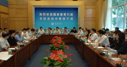章必功首先代表學校對國家教育行政學院一行的到訪表示歡迎。他向客人們介紹我校基本的發展情況:深圳大學創25年以來,一直在探索中不斷前進。我們以改革為動力,全力建設一所為經濟特區提供骨干人才和高端人才培養、高端智力服務、高端科技成果的特區大學。用23年時間打造了一個完整的人才培養體系,實現了從學士、碩士到博士三級跳;用十年時間實現了為大眾化教育服務的教學規模,這在中國教育史上值得大書一筆。
