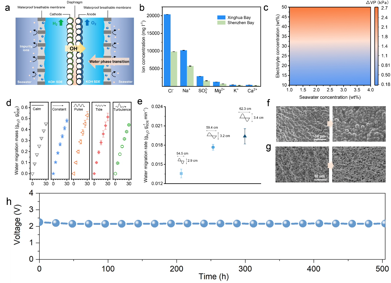 2024年6月21日,深圳大學謝和平院士團隊在Nature Communications上發表了題為“In-situ direct seawater electrolysis using floating platform in ocean with uncontrollable wave motion”的研究成果。該研究基于謝和平院士團隊2022年11月30日在Nature上發文開創的相變遷移海水直接電解制氫全新原理與技術,圍繞在真實大海中實現海水直接制氫面臨的海水多場耦合復雜工況帶來的波動性等科學難題與工程空白,提出了抵抗真實大海不可控海洋波動環境的海水直接制氫全新路徑與技術;系統研究了不同海水組分(深圳灣、興化灣)濃度變化導致的界面蒸氣壓差差異,闡明了濃度動態變化下相變遷移過程的自調控自適應機制;首次揭示了在不同海浪波形(恒流、亂流等)、波高、波寬條件下的相變遷移過程規律與影響機制,表明了在海浪一定程度沖擊下有利于防止界面濃度極化從而提升相變傳質效果;基于界面傳質面積動態變化規律建立了真實海浪波動下的相變遷移海水制氫理論模型,并在實驗室模擬海洋環境下實現了500h以上穩定性,未發生催化劑腐蝕、毒性和腐蝕性,充分驗證了電解系統、防水透氣層等核心關鍵部件在復雜環境下的耐受性與抵御能力,為在真實大海不可控波動環境下規模化海水直接電解制氫提供了理論指導并奠定未來產業化發展基礎。