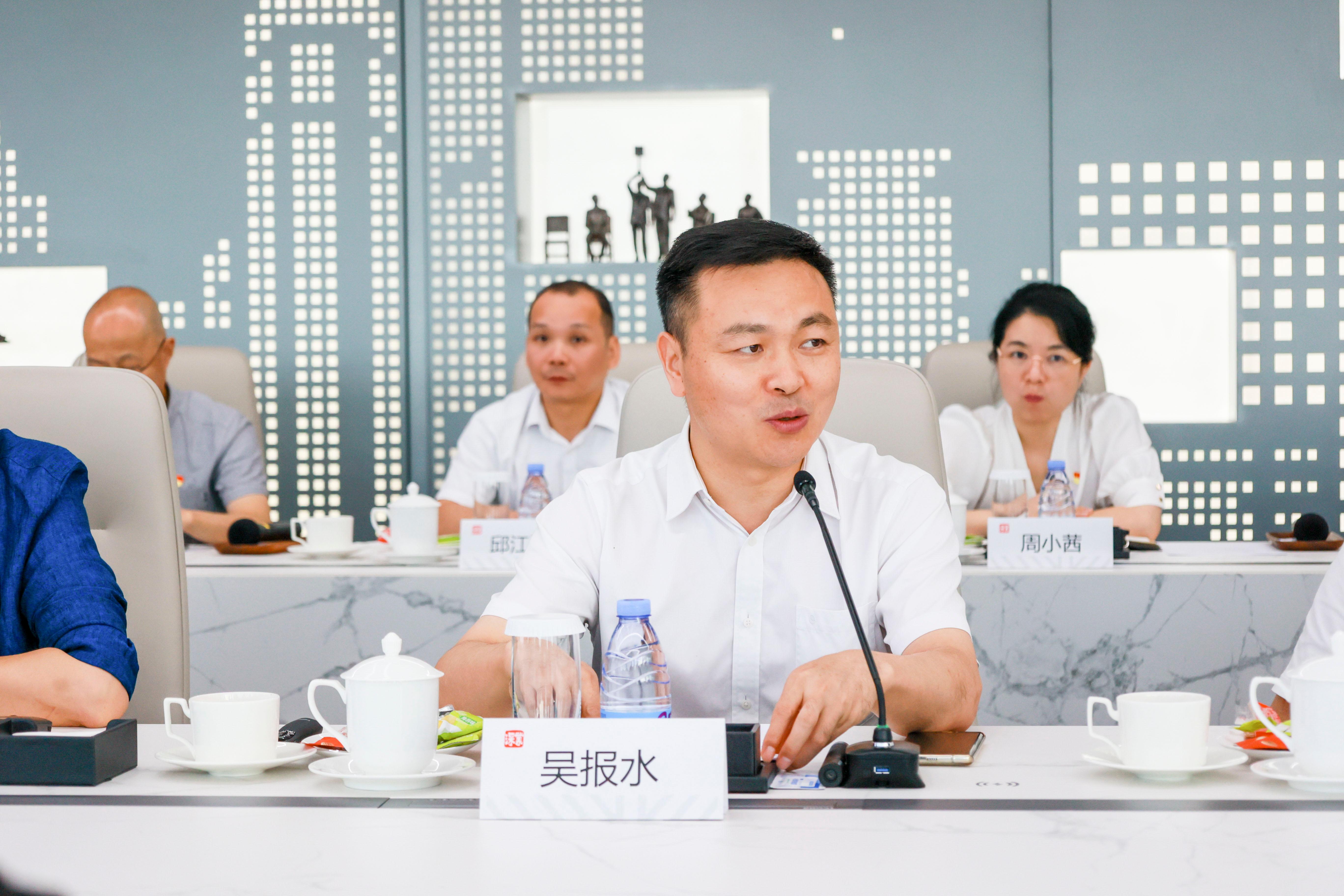 在位于深業上城的深業集團,吳報水一行參觀深業上城元宇宙體驗黨群服務中心和城市云客廳。黨群服務中心引進前沿科技,賦能黨建文化,數字人黨建服務講解員、穿越平行時空虛擬體驗、VR沉浸式體驗區等一系列黨建空間設施,體現“黨建+科技”“黨建+文化”的成效;城市云客廳聚焦黨建與經營相融雙促,以員工笑臉墻、深業運營智慧平臺、航天育種農業技術攻堅戰等成果展示,體現深業上城以高質量黨建引領高質量發展的理念。隨后,雙方進一步展開座談。