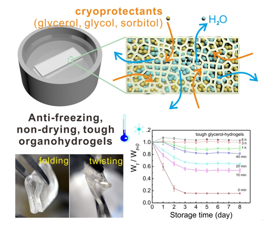 韌性水凝膠,一種具有良好機械性能的水凝膠,在組織工程、健康醫療、電子皮膚、軟體機器人等領域具有重要的應用前景,近年來引起了研究人員的極大關注。但由于極高的含水量,導致了其在干燥、低溫環境中分別容易失水和結冰,極大地限制了它的使用范圍和實際應用場景。最近,周學昌課題組發明了一種新型的溶劑置換法,將韌性水凝膠成功改造成低蒸發且抗結冰的含水量可控韌性有機凝膠,從而解決韌性凝膠在空氣中易干和低溫下易結冰問題。該方法簡單易行、成本低廉、通用性強,有望推動和進一步擴展韌性水凝膠甚至是水凝膠在復雜環境中(尤其是極端低溫、干燥甚至真空條件下)的實際應用。