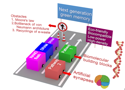 存儲器是一類具有記憶功能的電子元器件,在半導體領域受到廣泛的應用。受限于摩爾定律和傳統馮諾依曼結構瓶頸,近年來存儲設備的發展明顯放緩。如何突破這些限制,制備性能更優異的存儲器具有重要的研究價值。源于自然,模仿自然,超越自然為科學發展提供了一種重要思路。本文創新性地提出了從生物視角解決存儲器發展中遇到的問題,從生物基存儲器和人工突觸兩個方面詳細的闡述了生物存儲器在非易失型存儲設備中的理論研究和實際應用價值。