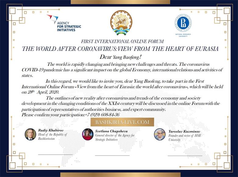 4月28日,我校楊寶峰院士應邀參加了俄羅斯巴什基爾共和國、烏法市及巴什基爾國立醫科大學共同主辦的上海合作組織及金磚國家“新冠肺炎疫情當下的世界:歐亞大陸核心觀點”首屆網絡在線論壇,深入討論二十一世紀“后新冠時代”的經濟和社會發展趨勢。