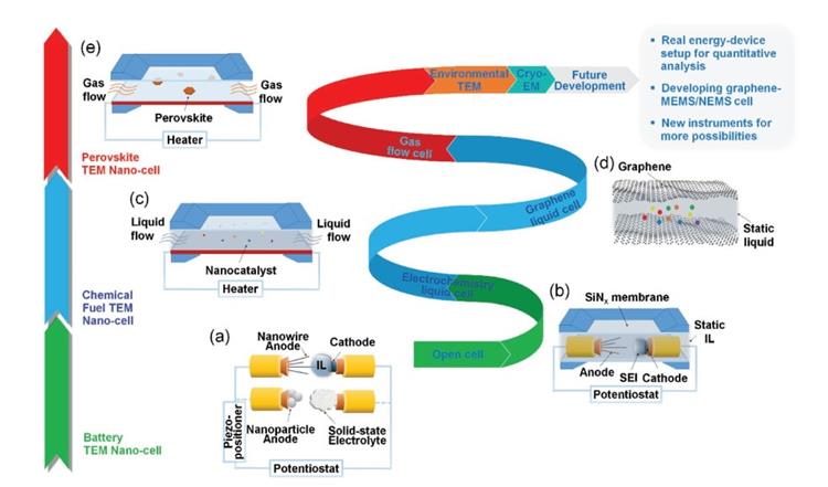 圖. 原位透射電鏡樣品腔以及在鋰電池、化學燃料電池、鈣鈦礦太陽能電池等領域發展歷程。(Adv. Mater. 2019, 1900608.)
