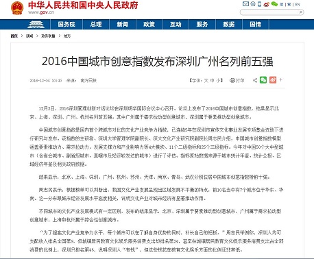 2016年12月3日,2016中國城市創意指數(CCCI2016)在第二屆深圳管理創新對話論壇上發布后,受到深圳衛視、《中國質量報》、《南方日報》、《南方都市報》、《深圳特區報》、中國財經網、新華網、新浪網、搜狐網、網易網、騰訊網、東方網等多家媒體報道和轉載。特別值得一提的是,中華人民共和國中央人民政府網站與廣東省人民政府網站等權威網站也轉載了相關報道。