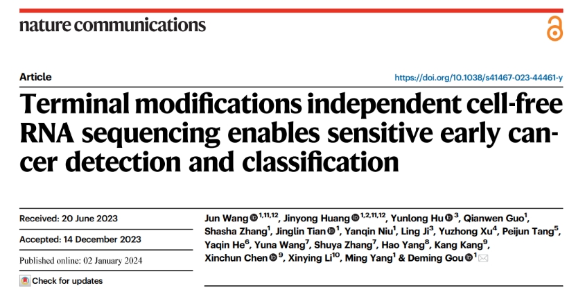 2024年1月2日,深圳大學(xué)生命與海洋科學(xué)學(xué)院茍德明教授團(tuán)隊(duì)在Nature出版社旗下期刊《Nature Communications》(影響因子:16.6)發(fā)表題為“Terminal modifications independent cell-free RNA sequencing enables sensitive early cancer detection and classification”的研究論文。深圳大學(xué)生命與海洋科學(xué)學(xué)院茍德明教授為通訊作者,王俊助理教授和黃金涌博士后為共同第一作者。