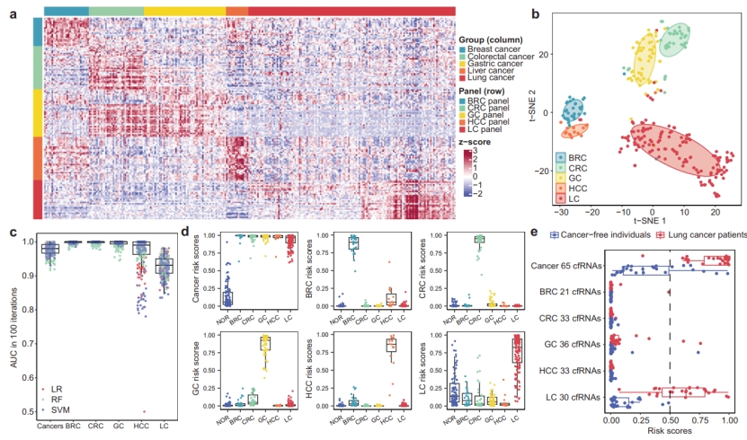 為評(píng)估SLiPiR-seq在多癌種分類的可行性,研究團(tuán)隊(duì)利用該技術(shù)額外對(duì)30例乳腺癌,37例結(jié)直腸癌,55例胃癌,15例肝癌進(jìn)行了血漿cfRNA檢測(cè)。通過機(jī)器學(xué)習(xí)分析,研究團(tuán)隊(duì)建立了一個(gè)通用的癌癥檢測(cè)模型和肺癌、乳腺癌、結(jié)直腸癌、肝癌、胃癌五種癌癥特異的診斷分類模型,證明了cfRNA的差異表達(dá)譜在癌癥診斷和分類中具有強(qiáng)大的性能。因此,血漿cfRNA可以作為癌癥的生物標(biāo)志物應(yīng)用于臨床。