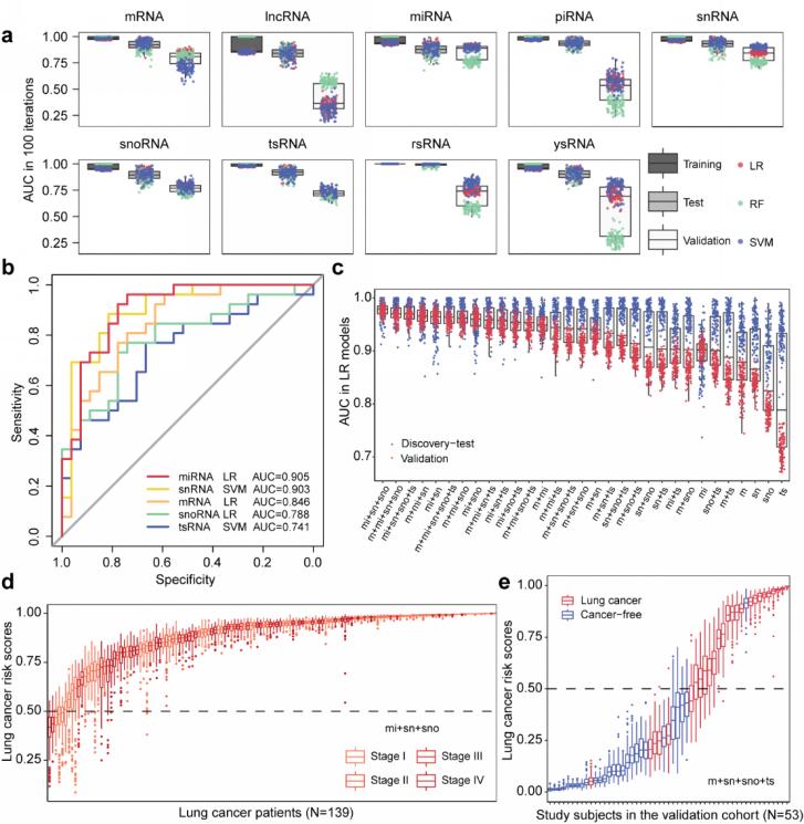 為了評(píng)估SLiPiR-seq 技術(shù)在肺癌檢測(cè)中的應(yīng)用效果,該研究對(duì)139 名肺癌患者和 106 名無癌癥個(gè)體的發(fā)現(xiàn)隊(duì)列進(jìn)行了回顧性分析。基于 cfRNA 計(jì)數(shù)的負(fù)二項(xiàng)分布模型在病例和對(duì)照之間確定了12840個(gè)差異表達(dá)的 cfRNA(padj<0.1)。將上述隊(duì)列隨機(jī)分成 80%作為訓(xùn)練集,用來訓(xùn)練機(jī)器學(xué)習(xí)診斷模型,將 20%作為測(cè)試集,用來評(píng)估模型的區(qū)分效果。本研究采用了邏輯回歸、隨機(jī)森林、支持向量機(jī)三種機(jī)器學(xué)習(xí)算法來系統(tǒng)地評(píng)估九類RNA的肺癌診斷效果。為了避免偏差,所有模型的隨機(jī)取樣和訓(xùn)練-測(cè)試過程均重復(fù)進(jìn)行了 100 次。九類RNA所訓(xùn)練的模型在測(cè)試集中均取得了較好的分類效果。為了進(jìn)一步評(píng)估診斷模型在檢測(cè)早期肺癌方面的效果,對(duì)來自另外兩個(gè)臨床中心的獨(dú)立驗(yàn)證隊(duì)列進(jìn)行分析,該隊(duì)列包括26 名 I 期肺癌患者和27 名健康人。驚喜的是,mRNA(AUC=0.846)、miRNA(AUC=0.905)、snoRNA(AUC=0.788)、snRNA (AUC=0.903)和tsRNA(AUC=0.741)五類RNA所訓(xùn)練的模型可以精準(zhǔn)區(qū)分I 期肺癌患者和健康人。將這五類RNA組合來訓(xùn)練模型,發(fā)現(xiàn)由“mi+sn+sno”組成的模型具有最佳的早期肺癌檢測(cè)效果(AUC=0.979;發(fā)現(xiàn)隊(duì)列中靈敏性96.40%,特異性97.81%;獨(dú)立驗(yàn)證隊(duì)列中靈敏性100%,特異性78.79%)。在大規(guī)模早期篩查中,為了避免假陽性,高特異性往往比高靈敏性更重要。因此,該研究指出由“m+sn+sno+ts”組合訓(xùn)練的模型具有更高的特異性(發(fā)現(xiàn)隊(duì)列中靈敏性99.28%,特異性100%;獨(dú)立驗(yàn)證隊(duì)列中靈敏性76.92%,特異性95.24%),更加適合肺癌早篩的情景。