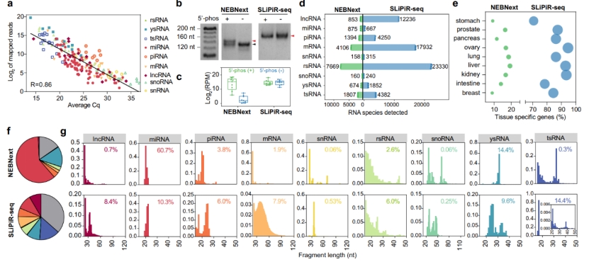 深圳大學(xué)茍德明教授團(tuán)隊(duì)長(zhǎng)期致力于展非編碼RNA 在肺部疾病的發(fā)病機(jī)制和臨床轉(zhuǎn)化研究,發(fā)明了Direct S-Poly(T)Plus等基于熒光定量PCR的小分子RNA定量檢測(cè)技術(shù)。為了滿足高通量的需求,該團(tuán)隊(duì)對(duì)此前技術(shù)進(jìn)行優(yōu)化,開發(fā)了靈敏的血漿cfRNA文庫制備技術(shù)(SLiPiR-seq),該技術(shù)具有不依賴RNA末端修飾的優(yōu)勢(shì),因此即使只用微量血漿(至少100微升)也依然能得到準(zhǔn)確可靠的檢測(cè)結(jié)果。SLiPiR-seq對(duì)RNA的定量結(jié)果與金標(biāo)準(zhǔn)熒光定量PCR技術(shù)具有很高的相關(guān)性。對(duì)比傳統(tǒng)的接頭連接文庫制備方法,SLiPiR-seq可以在血漿中檢測(cè)到更多種不同類型的RNA,其中, mRNA和長(zhǎng)非編碼RNA(lncRNA)的檢出量大大增加。由于可以更多的檢出與基因表達(dá)和調(diào)控相關(guān)的RNA種類,SLiPiR-seq技術(shù)在揭示血漿轉(zhuǎn)錄本與病理機(jī)制的關(guān)聯(lián)等研究中具有很好的前景。