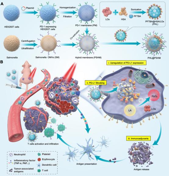 盡管免疫檢查點(diǎn)阻斷療法(ICB)具有巨大的臨床優(yōu)勢,但它仍然存在一些缺點(diǎn),如反應(yīng)率低、脫靶毒性和成本高昂。為了提高ICB的治療效果,并降低其治療成本,該團(tuán)隊(duì)設(shè)計(jì)并制備了一種由真核生物基因工程改造細(xì)胞膜與原核生物外膜囊泡組成的融合膜PSHM,其中真核生物膜來自于高表達(dá)PD-1蛋白的人腎上皮HEK293T細(xì)胞(PM),原核生物膜來自減毒的厭氧菌沙門氏菌OMVs(SM)。該融合膜修飾的乳酸氧化酶-全氟三丁胺納米乳(PHL@PSHM)可以同時(shí)上調(diào)腫瘤細(xì)胞的PD-L1表達(dá),提高PD-L1阻斷治療的反應(yīng)率;并靶向缺氧的腫瘤部位,實(shí)現(xiàn)由PD-1蛋白介導(dǎo)的高效PD-L1抑制;還可誘導(dǎo)紅細(xì)胞外滲到腫瘤中,在不損傷周圍組織的情況下對腫瘤進(jìn)行光熱消融,從而引起免疫原性細(xì)胞死亡,改善免疫抑制性的腫瘤微環(huán)境,提高ICB治療效果。這種光熱治療是基于腫瘤組織自身浸潤的血紅蛋白等吸光物質(zhì),具有極高的組織特異性。上述三管齊下的光熱-免疫協(xié)同療法,在三陰性乳腺癌和結(jié)腸癌皮下移植瘤模型中均實(shí)現(xiàn)了對原位皮下瘤和遠(yuǎn)端轉(zhuǎn)移瘤的高效抑制,顯著延長了小鼠的存活期。