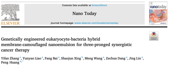 近日,深圳大學(xué)醫(yī)學(xué)部生物醫(yī)學(xué)工程學(xué)院黃鵬特聘教授團(tuán)隊(duì)張一帆助理教授在國際頂級學(xué)術(shù)期刊《Nano Today》(影響因子18.962,中科院一區(qū),TOP期刊)上發(fā)表了題為《Genetically engineered eukaryocyte-bacteria hybrid membrane-camouflaged nanoemulsion for three-pronged synergistic cancer therapy》的研究論文。該團(tuán)隊(duì)張一帆助理教授和廖云燕碩士生、白放碩士生為論文共同第一作者,黃鵬教授為通訊作者,深圳大學(xué)為唯一單位和唯一通訊單位,該團(tuán)隊(duì)所在的生物醫(yī)學(xué)工程學(xué)科屬于廣東省優(yōu)勢重點(diǎn)學(xué)科。
