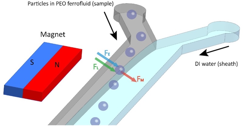 圖1在磁力、慣性力和彈性力作用下,細胞在PEO-磁流體/去離子水共流構型中的遷移。
