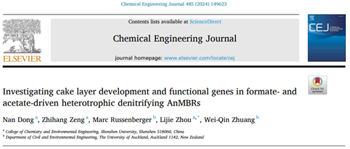 近日,深圳大學化學與環境工程學院周禮杰團隊在期刊《Chemical Engineering Journal》(影響因子15.1,中科院JCR 1區,TOP期刊)上發表了題為《Investigating cake layer development and functional genes in formate- and acetate-driven heterotrophic denitrifying AnMBRs》的研究論文。該團隊周禮杰副教授為論文唯一通訊作者,碩士研究生董楠為論文第一作者,深圳大學為第一作者單位及通訊單位。