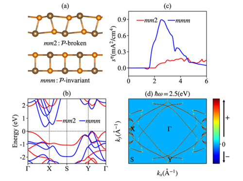 王健教授等利用非線性響應理論,發展了絕緣體中二階直流散粒噪聲的量子理論,將二階光電流算符分成非對角和對角兩部分,分別得到了位移和注入兩種直流散粒噪聲。通過對稱性分析,發現兩種二階直流散粒噪聲不受空間反演對稱性限制,可以出現在中心對稱的量子材料中。本文研究發現,二階直流散粒噪聲和量子材料的量子幾何張量(包括貝里曲率和量子度規)密切相關。最后,本文將發展的散粒噪聲理論和第一性原理計算相結合,預測了二維材料GeS和MoS2中的二階直流散粒噪聲。計算結果顯示,GeS的中心對稱相(mmm)中二階直流散粒噪聲強于其非中心對稱相(mm2),如圖1所示。