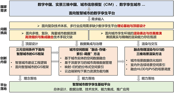 “智慧城市數(shù)字孿生平臺(tái)關(guān)鍵技術(shù)及應(yīng)用”項(xiàng)目面向城市立體化、精細(xì)化管理需求,以建設(shè)智慧城市數(shù)字孿生平臺(tái)為目標(biāo),系統(tǒng)開展多維、復(fù)雜、海量的城市級(jí)三維數(shù)據(jù)的高效組織、動(dòng)態(tài)調(diào)度、實(shí)時(shí)分析計(jì)算、高并發(fā)訪問、高逼真渲染等關(guān)鍵技術(shù)研發(fā)。