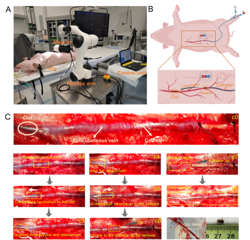 血栓性疾病,如缺血性卒中、肺栓塞和心肌梗死,嚴重威脅人類健康?,F有治療方法如機械取栓和溶栓等,存在操作復雜、治療時間長及潛在副作用等問題。為了克服這些挑戰,研究團隊合成了高酶活性的tPA-modified 納米顆粒。在設計的磁場作用下,tPA-microswarm 能沿血管壁精準降解血栓并快速剝離碎片(圖1)。碎片被磁化后,通過螺旋游動推進,最終由導管吸力回收。整個過程,包括導管輸送、可控運動、血栓剝離和回收,可在約半小時內完成,顯著快于傳統溶栓治療時間。研究表明,該策略在模擬血管和活體豬模型中均展現高效性與安全性(圖2),為急性血栓性疾病的快速治療提供新可能。