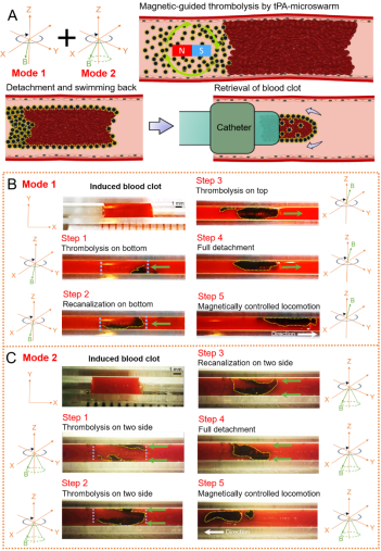 圖1.兩種磁驅動模態下的快速血栓脫壁剝離與碎塊磁化。