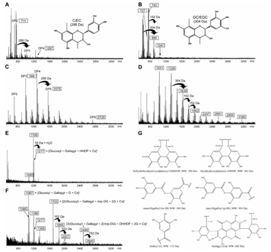 在抗氧化活性測試中,研究采用了Folin-Ciocalteu、FRAP、TEAC和DPPH四種方法,結果顯示HT的抗氧化能力最強,其次是PD和PC,且聚合體的抗氧化活性普遍高于寡聚體(圖2)。這主要歸因于結構中對苯二酚和兒茶酚型羥基的數量和位置,HT因富含GA而具有更多的羥基,從而表現出更強的抗氧化活性(圖1)。