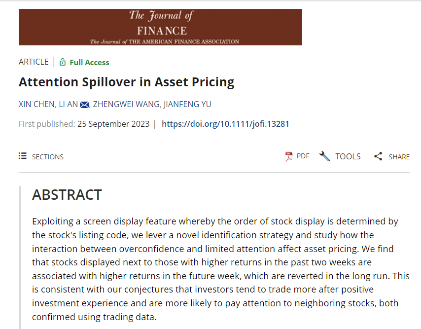 近日,我校金融科技學院陳鑫助理教授在金融學領域的國際頂級期刊《Journal of Finance》上發表論文“Attention Spillover in Asset Pricing”。該期刊是美國金融協會(American Finance Association)創辦的期刊,也是美國德克薩斯大學達拉斯分校(University of Texas, Dallas)選出的用于評估國際商學院研究能力的24本學術期刊(簡稱UTD 24)之一。該論文的發表大大提升了我校金融科技學院在金融學及相關領域的學術影響力,也是我校金融科技學院高質量科研成果、高水平學科建設的重要體現。